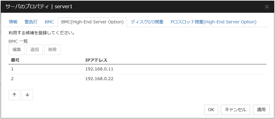 サーバを追加します。サーバ名、IP アドレスなどを設定します。Express5800/A1080a,A1040a シリーズ連携固有の項目はありません。