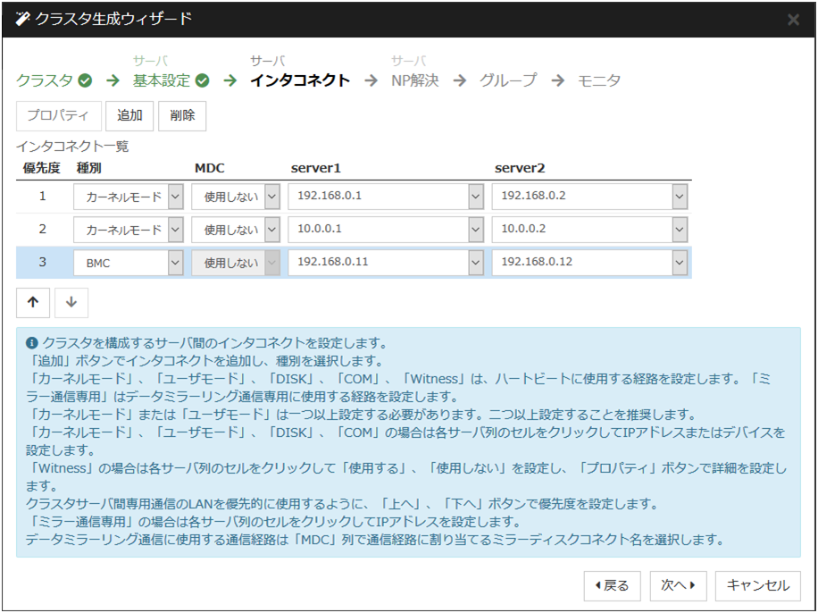 1. BMC ハートビートの送受信に使用する通信経路 (インタコネクト) は、[種別] 列のセルをクリックして、[BMC] を選択してください。各サーバの列のセルをクリックし BMC の サーバ Web コンソール用IP アドレスを入力してください。