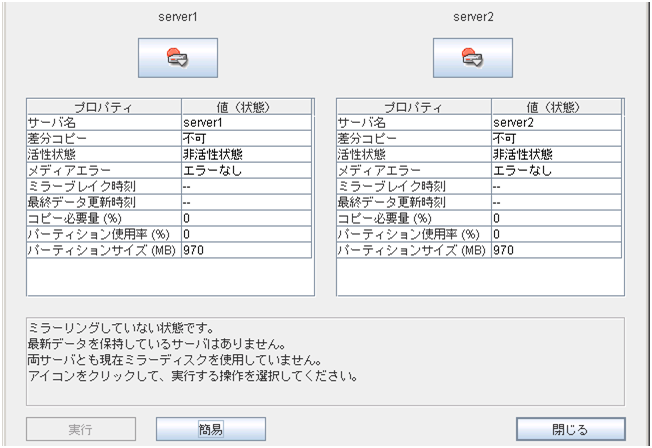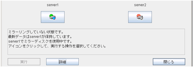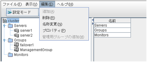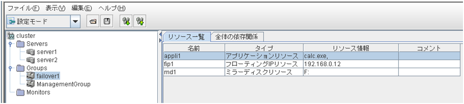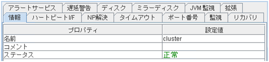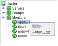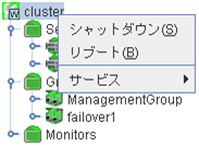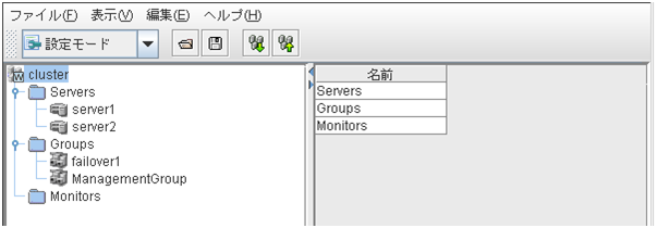 サーバ、グループリソース等の各クラスタ資源の状態が確認できます。詳しくは「 2.3. WebManager のツリービューで各オブジェクトの状態を確認するには 」を参照してください。