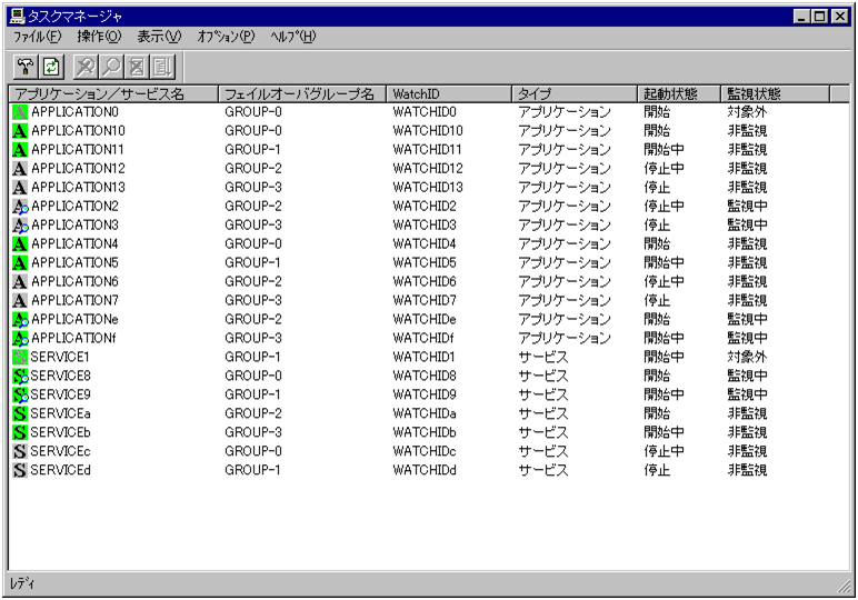 アラート検索を実行します。[ツール] メニューの [アラート検索] を 選択するのと同じです。 ログを採取します。[ツール] メニューの [クラスタログ採取] を選択するのと同じです。 リロードを実行します。[ツール] メニューの [リロード] を選択 するのと同じです。 オプションを表示します。[ツール] メニューの [オプション] を選択するのと同じです。 時刻情報を表示します。[ツール] メニューの [時刻情報] を選択するのと同じです。時刻情報が更新された場合、アイコンが変わります。時刻情報ダイアログを表示するとアイコンは元に戻ります。 統合マネージャを表示します。[ツール] メニューの [統合マネージャ] を選択するのと同じです。