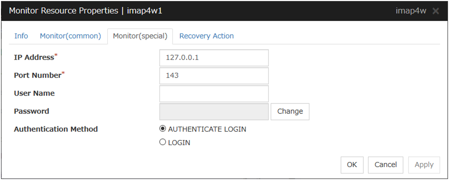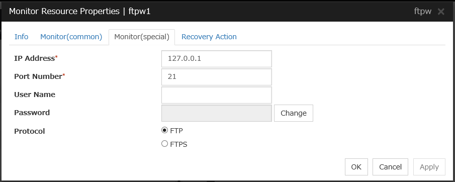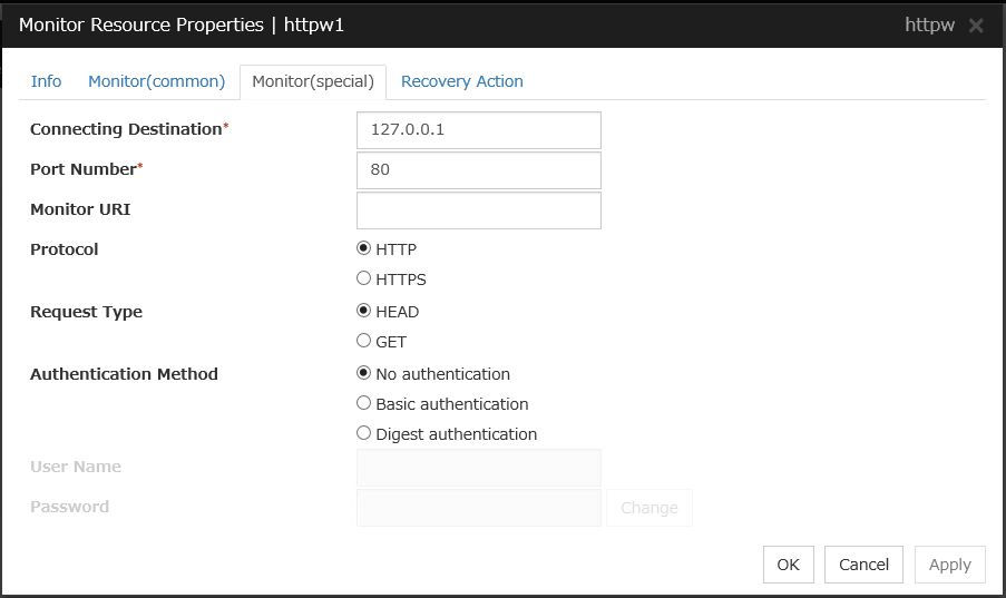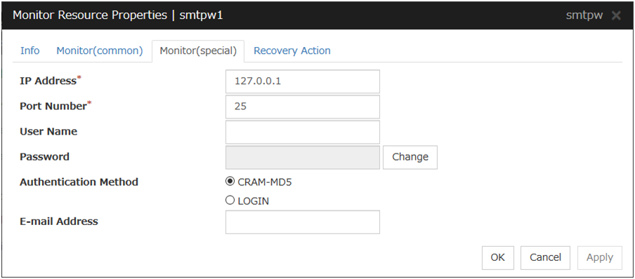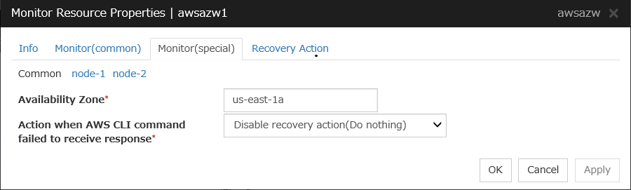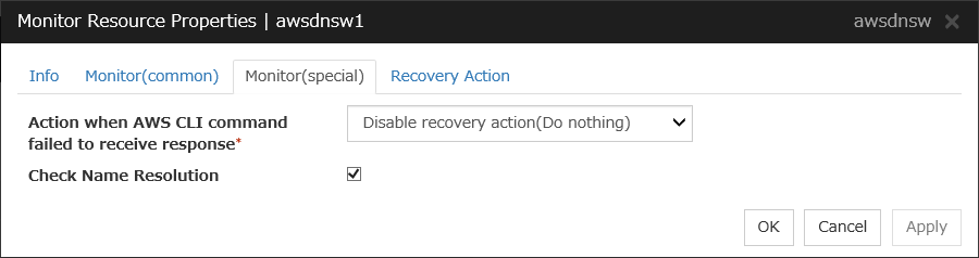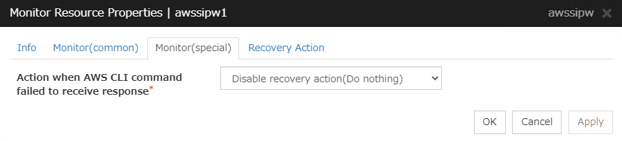 If no actions are to be taken, because the failure of the AWS CLI command does not mean an error in the monitoring target, it is recommended to select Disable recovery action(Do nothing). Even in this case, you can detect an error in failing to check the health of a registered IP address.