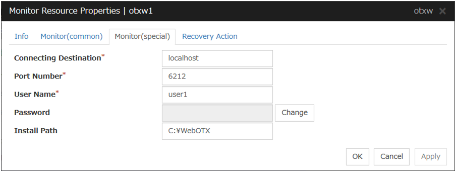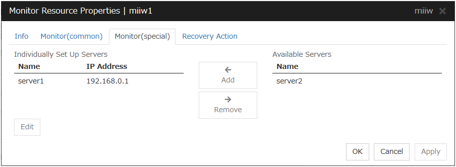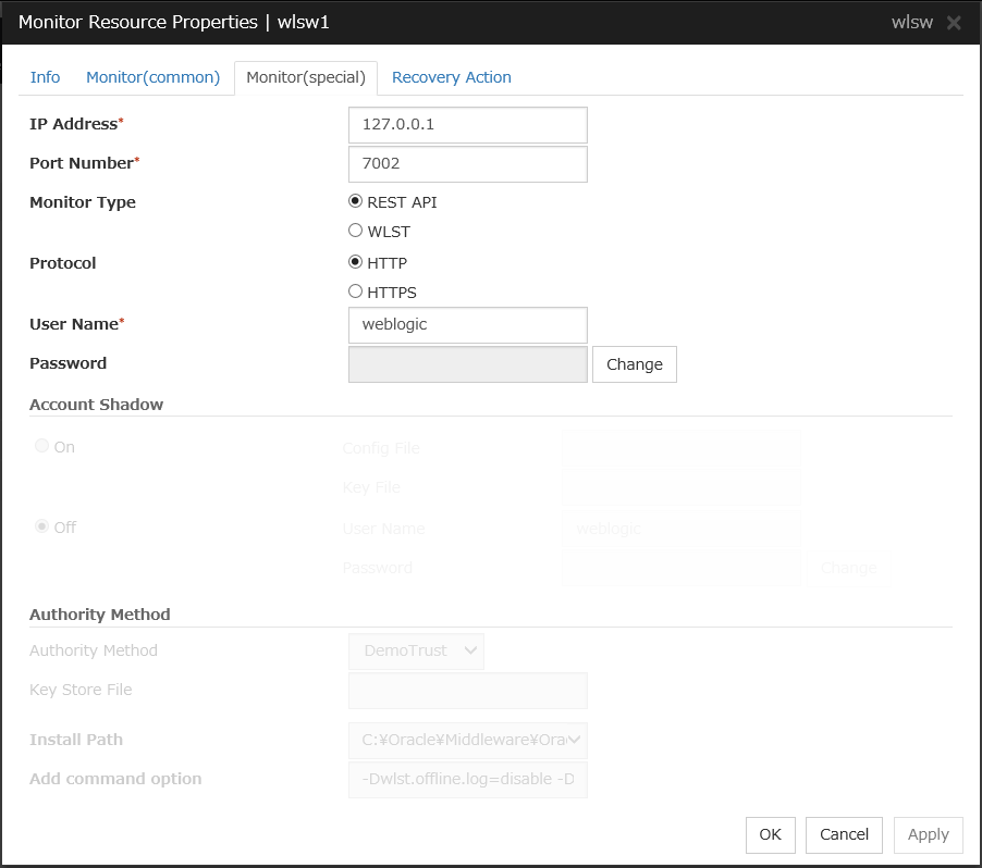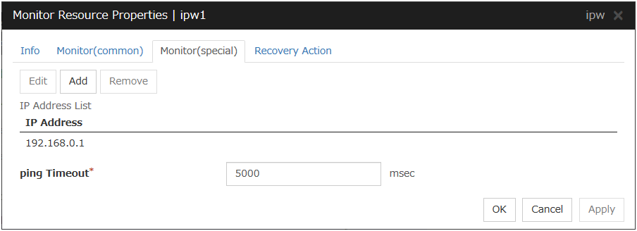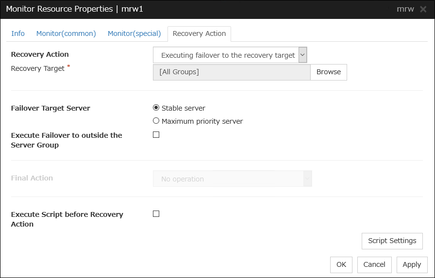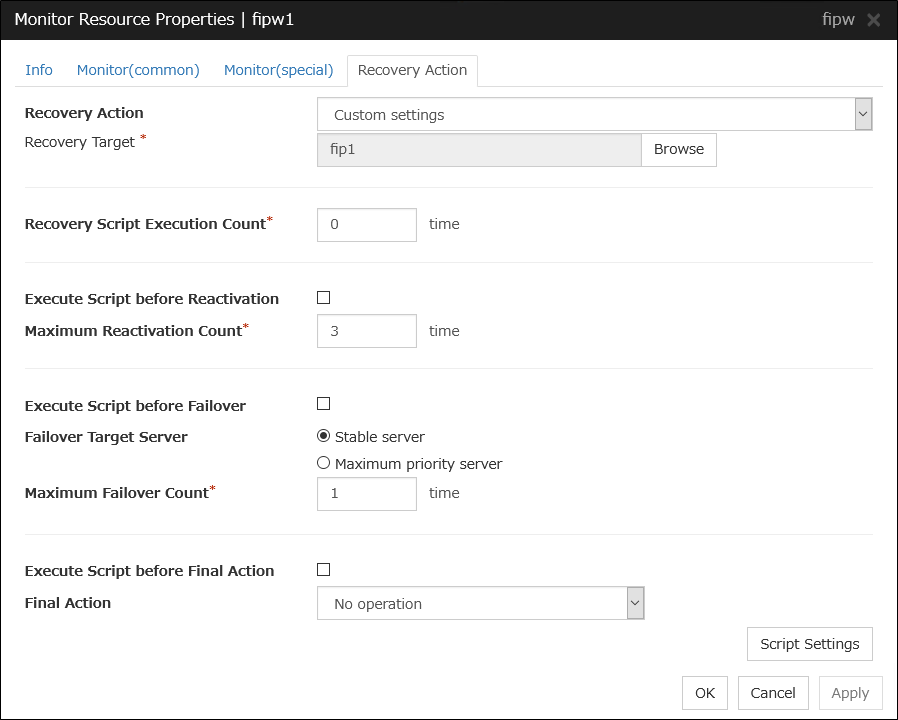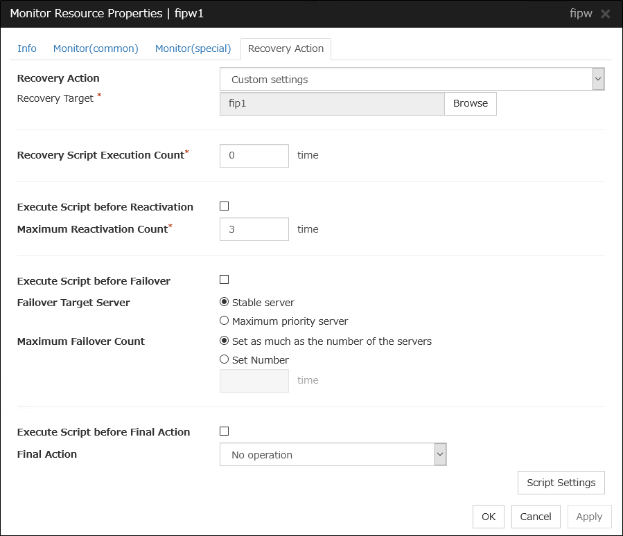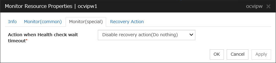 Select Disable recovery action(Do nothing) if you think this error is CLI command failure (a monitoring target itself is in normal status) and no action needs to be taken. This option is recommended as still error detection can find errors, for example when troubles are found in IP addresses.