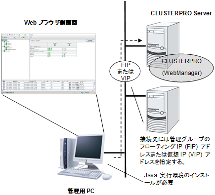 管理用 PC の Web ブラウザから接続する際の URL には、WebManager 接続用のフローティング IP アドレスまたは仮想 IP アドレスを指定します。これらのアドレスは管理グループのリソースとして登録されます。管理グループが存在しない場合、クラスタを構成するいずれかのサーバの実 IP アドレス (そのサーバに固定的に割り当てられたアドレス) を指定して接続することもできますが、この場合は接続先サーバがダウンしているとクラスタの状態を取得できなくなります。