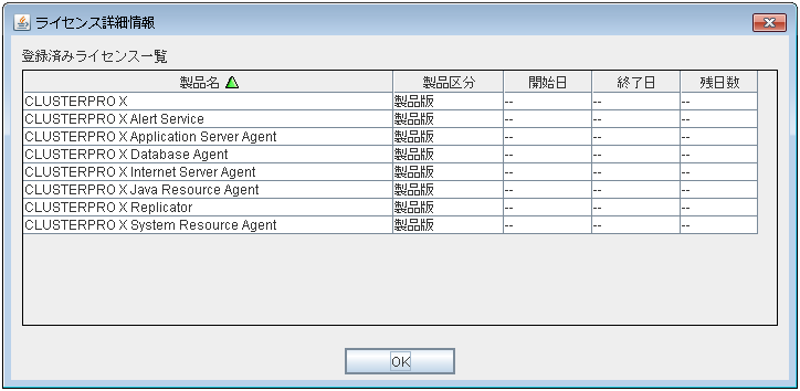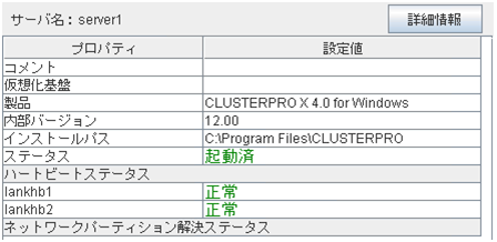 上段には、ツリービューで選択した各クラスタ資源についての情報が表示されます。下段には、各サーバ、各グループリソースや各モニタリソースの起動・停止状況とコメントが一覧表示されます。また、右上の [詳細情報] をクリックすると、さらに詳しい情報がダイアログで表示されます。詳しくは「 2.4. WebManager のリストビューでクラスタの状態を確認する 」を参照してください。