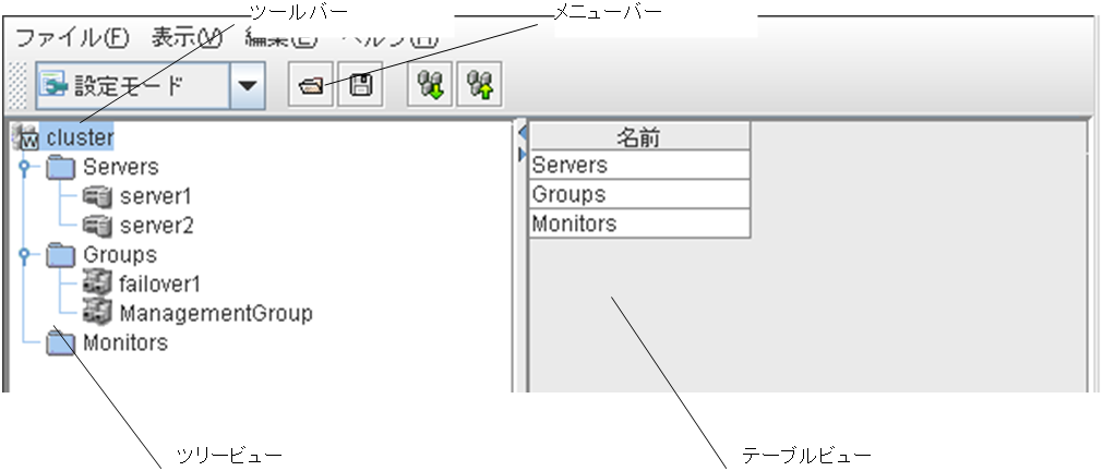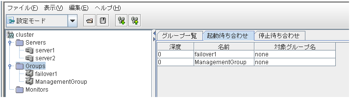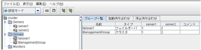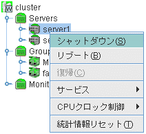 サーバ、グループリソース等の各クラスタ資源の状態が確認できます。詳しくは「 2.3. WebManager のツリービューで各オブジェクトの状態を確認するには 」を参照してください。