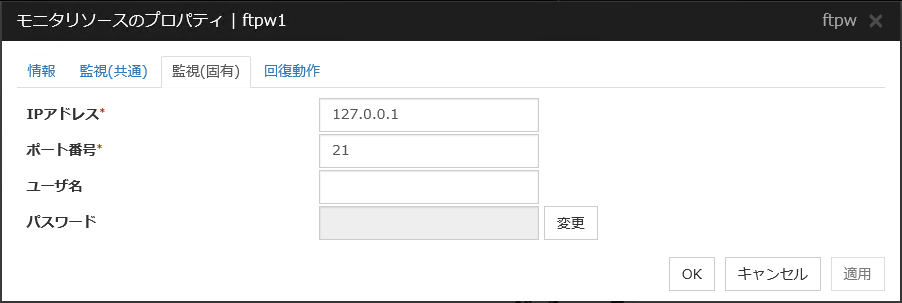 チェックボックスがオン(既定)登録した IP アドレスが仮想ホスト名(DNS 名)の名前解決によって得られるかを確認します。 チェックボックスがオフ監視しません。