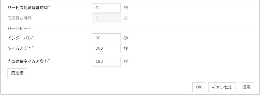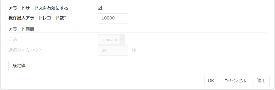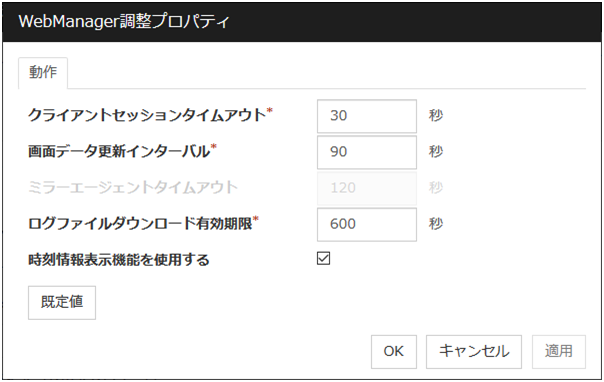 - 遅延警告割合に0を設定した場合監視毎に遅延警告がアラート通報されます。この機能を利用し、サーバが高負荷状態でのモニタリソースへのポーリング時間を算出し、モニタリソースの監視タイムアウト時間を決定することができます。