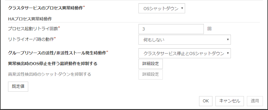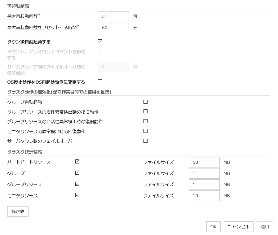 活性異常、非活性異常検出時の最終動作、またはモニタリソース異常検出時の最終動作としてOSの再起動を伴うような設定をしている場合に、シャットダウン回数、または再起動回数を制限することができます。