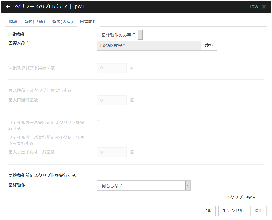 非活性異常検出時の最終動作に「何もしない」を選択すると、グループが非活性失敗のまま停止しません。 本番環境では「何もしない」は設定しないように注意してください。