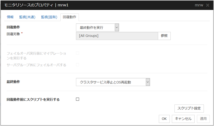 グループリソース、モニタリソース異常検出後の最終動作実行前スクリプト
