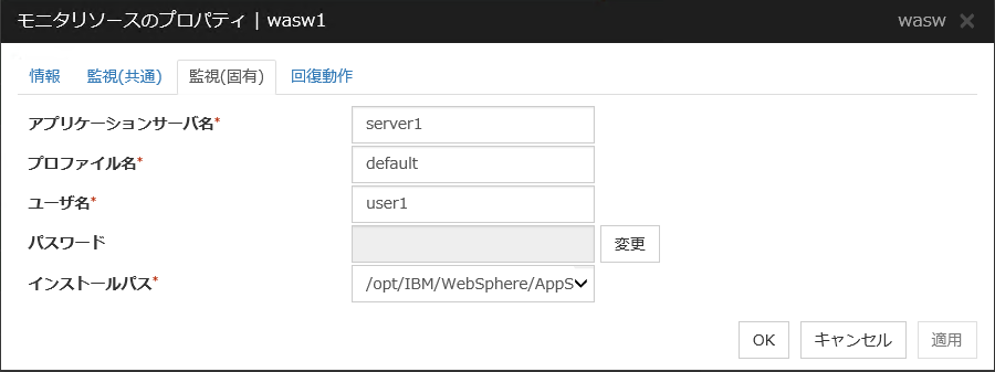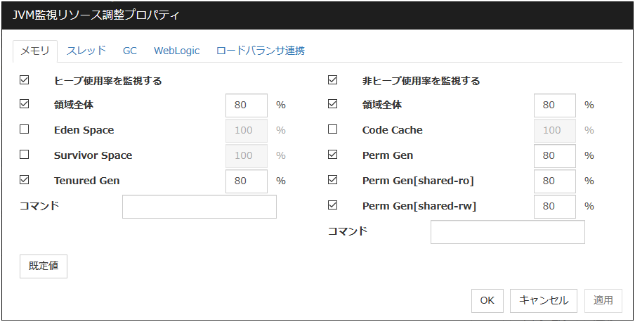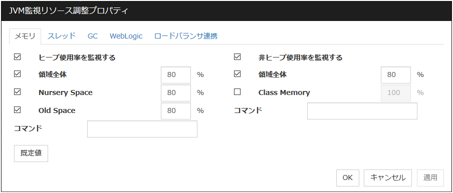 - 監視対象 Java VM の起動オプションに「-XX:+UseG1GC」が付加されている場合、Java 7 以前では JVM モニタリソースの [プロパティ] - [監視(固有)] タブ - [調整] プロパティ-[メモリ]タブ内の設定項目は監視できません。Java 8 以降では JVM モニタリソースの [プロパティ] - [監視(固有)] タブ - [JVM種別] に [Oracle Java(usage monitoring)] を選択することで監視可能です。