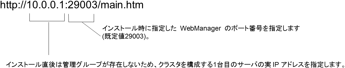 管理用 PC の Web ブラウザから接続する際の URL には、WebManager 接続用のフローティング IP アドレスまたは仮想 IP アドレスを指定します。これらのアドレスは管理グループのリソースとして登録されます。管理グループが存在しない場合、クラスタを構成するいずれかのサーバの実 IP アドレス (そのサーバに固定的に割り当てられたアドレス) を指定して接続することもできますが、この場合は接続先サーバがダウンしているとクラスタの状態を取得できなくなります。