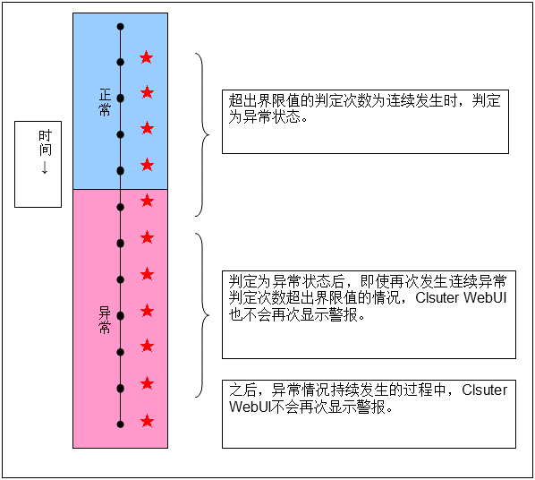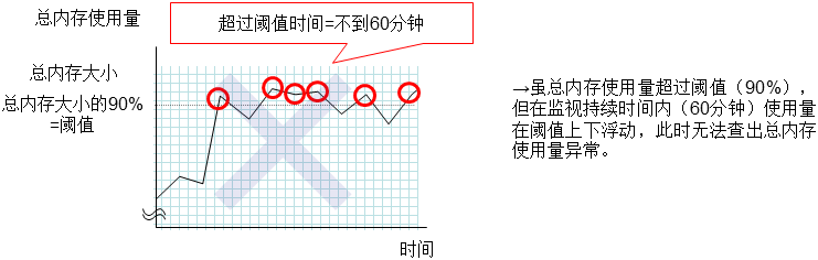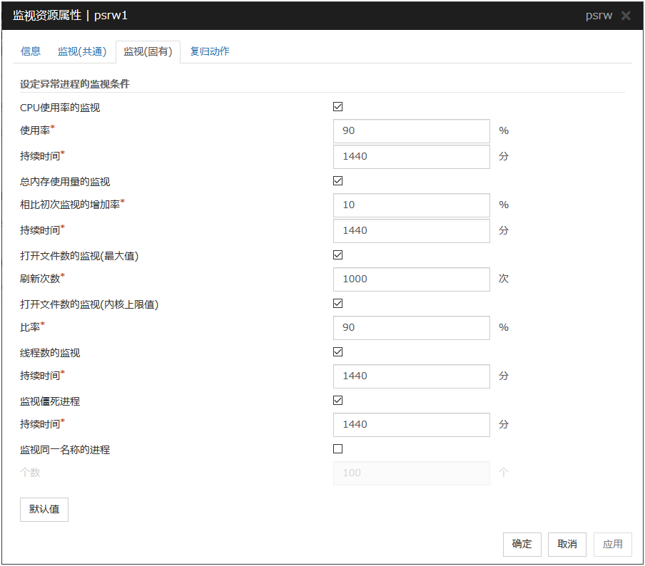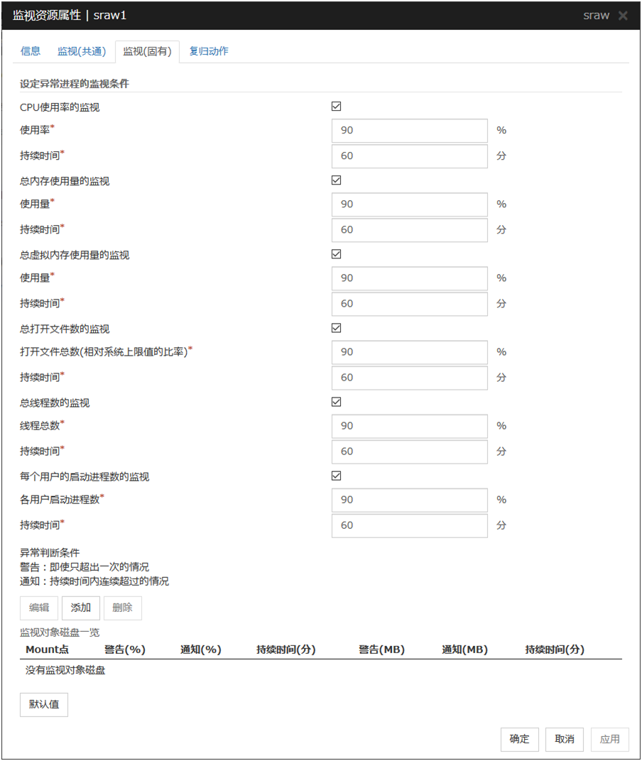 - 资源监视器的监测模式System Resource Agent通过「最多次数」和「监视持续时间」两个参数的组合进行检测。通过继续收集各系统资源(打开文件数、用户访问数、线程数、内存使用量、CPU 使用率、虚拟内存使用量),当一定时间内(指定为持续时间的时间)超过最多次数时,就会检测出异常。