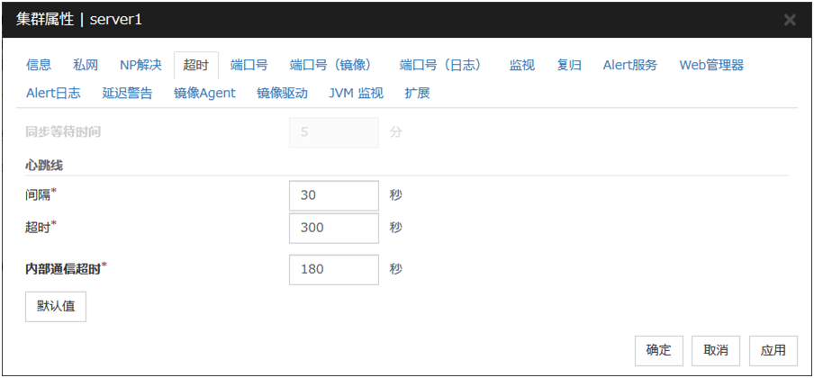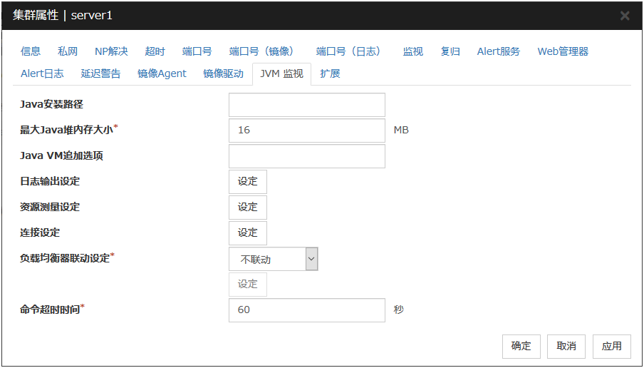 如果将通过Cluster WebUI ([集群的属性]->[JVM监视]标签页->[最大Java堆大小])设置的最大Java堆大小值设置为3000等大数值,则JVM监视器资源会启动失败。由于依赖于系统环境,请根据系统的内存搭载容量来决定。