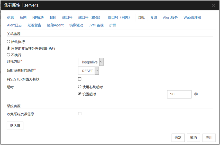 在更改监视资源的集群统计信息设置时,即使执行了挂起/复原,也无法在消息接收监视资源中反映集群统计信息的设置。如果要在消息接收资源中也反映集群统计信息,请重启操作系统。