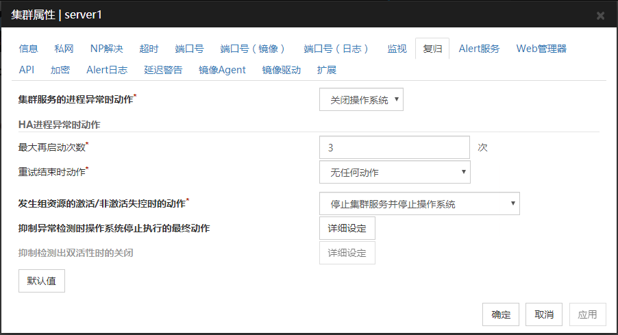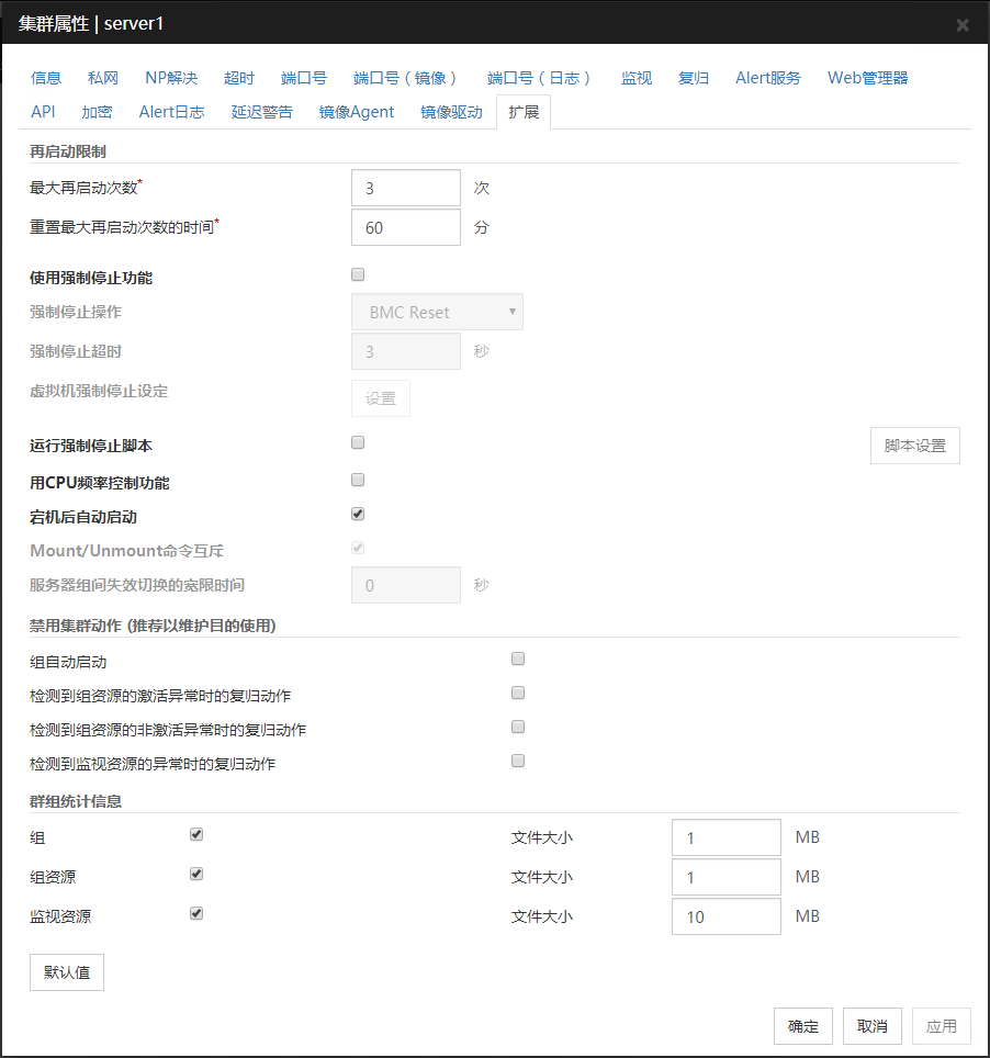 将[停止集群Daemon并关闭操作系统] 或[停止集群Daemon并重启操作系统] 作为激活异常、非激活组资源查出异常时的最终动作或监视资源查出异常时的最终动作与重启OS同时执行时,能够限制查出监视资源异常导致的关机次数或重启次数。