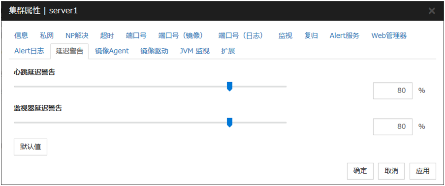 - 将延迟警告比例设置为0时每次执行监视都会通报延迟警告。可利用该功能计算出服务器在高负载状态下监视资源的监视时间,从而决定监视资源的监视超时时间