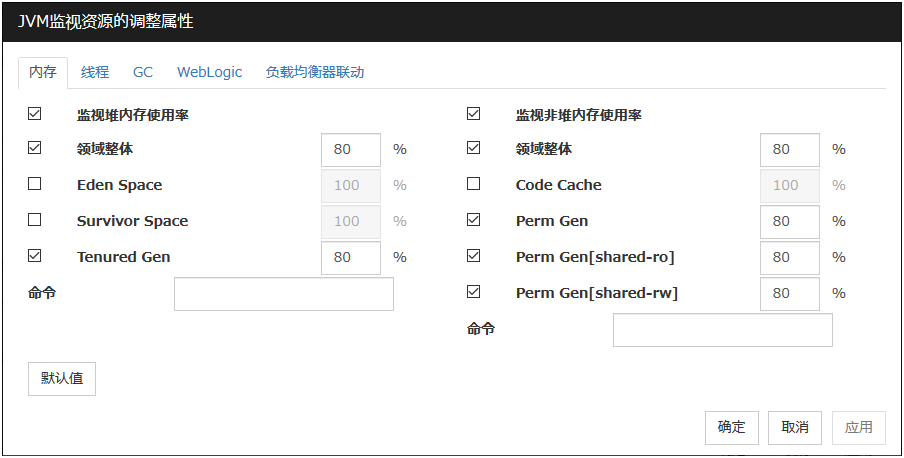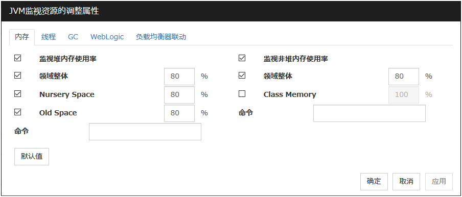 - 在监视对象Java VM的启动选项添加「-XX:+UseG1GC」时,在Java 7以前则不能监视JVM监视资源的[属性]-[监视(固有)]标签页-[调整]属性-[内存]标签页内的设置项目。在Java 8以后,可通过在JVM监视资源的[属性]-[监视(固有)]标签页--[JVM类型]选择[Oracle Java(usage monitoring)]来进行监视。