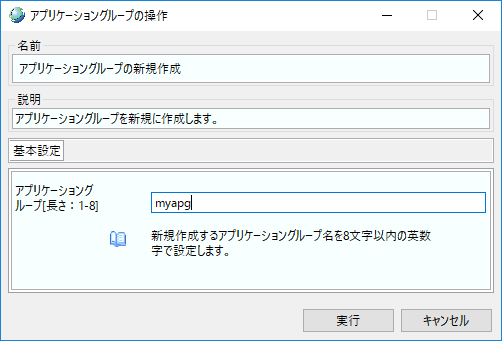 具体例を挙げると、「myapg」という名前のアプリケーショングループを作成するには、次のようにします。