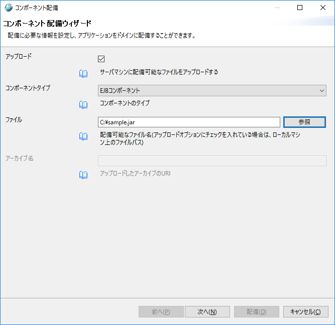 配備するには、Java EEのアプリケーションのアーカイブを指定してオペレーションdeployを実行します。 WebOTX AS Standardの場合は、配備先のアプリケーショングループ名とプロセスグループ名を指定することができます。