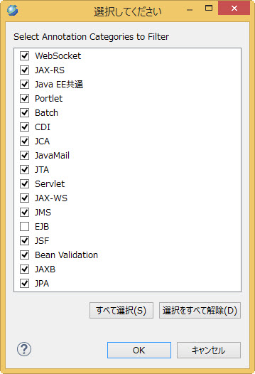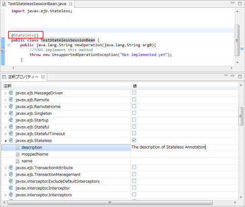 1.javax.ejb.TransactionAttributeやjavax.interceptor.InterceptorsなどTargetがType、Method両方であるアノテーションは、クラス名が選択された場合もメソッドが選択された場合も、一覧に表示されます。