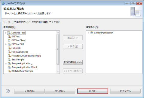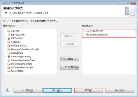 表示された プロジェクトの追加および除去 画面に 構成プロジェクト リストに「DynWebTest」と「SampleApplication」二つのプロジェクトがあることを確認後、