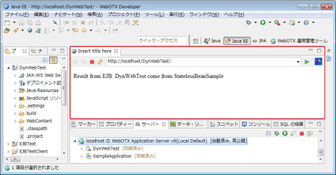 (EJBアプリケーションのチュートリアルの「1.ステートレスセッションBean」に作成されるEJBプロジェクトと動的Webプロジェクトを含ますEARプロジェクト「SampleApplication」と動的Webプロジェクトを使用します。)