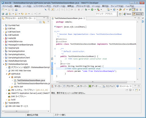 デバッグしたいソースを開きます。ここでは、TestStatelessSessionBean.javaのソースを開いています。