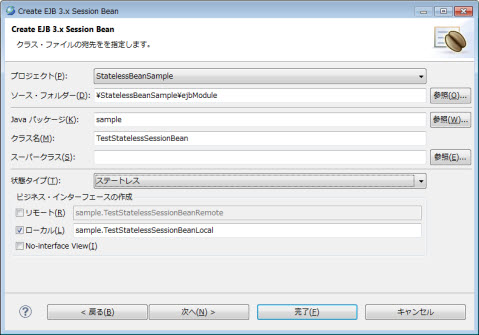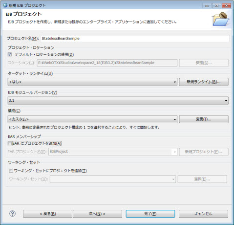 | EJB プロジェクト | 新規作成したプロジェクトを選択します。 | 選択されたプロジェクト名です。 |