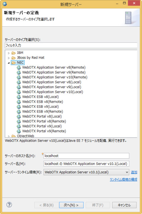 NEC > WebOTX Application Server v10(Local)を選択します。