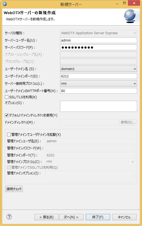 WebOTXサーバーの新規作成画面で、サーバーのバージョン、サーバーユーザー名、サーバーパスワード、ユーザードメイン名、ユーザードメインポート及びユーザードメインのHTTPポート番号を設定してください。(サーバーバージョンはStandard、Enterprise