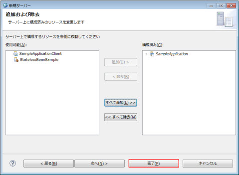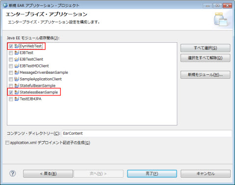 EEモジュール依存関係リストから追加したいEJBプロジェクトやアプリケーション・クライアント・プロジェクトなどを選択して、完了