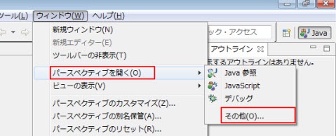 パースペクティブを開く画面で、Java