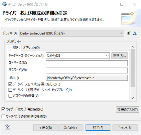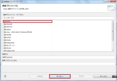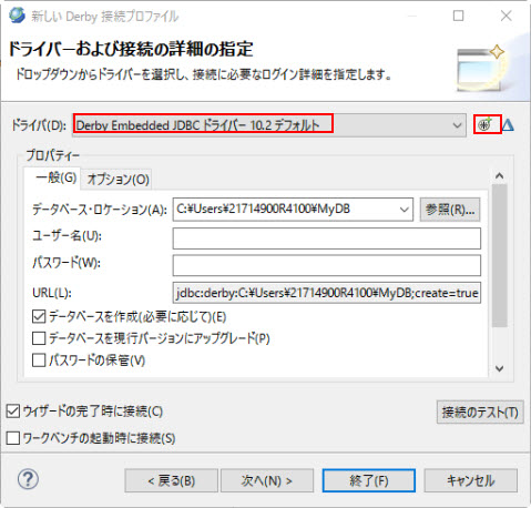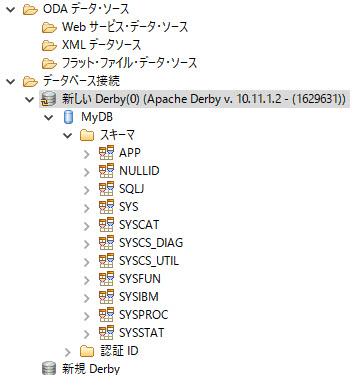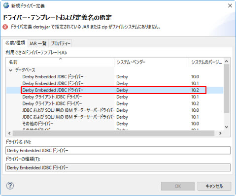 Developerインストール時、Derby 組み込み JDBC ドライバー 10.2 デフォルト というドライバーが自動的に作成されます。