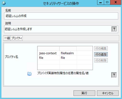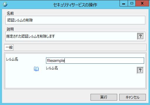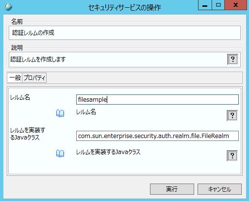 2の設定を行うことで使用するレルムを変更することができます。レルムの設定を完全に削除する場合は次の手順を行ってください。 [domain1]-[アプリケーションサーバ]-[セキュリティサービス]を右クリックし、[認証レルムの削除]を選択してください。レルム名 に削除するレルムの名前(本例ではfilesample)を入力し、[実行]ボタンをおしてください。