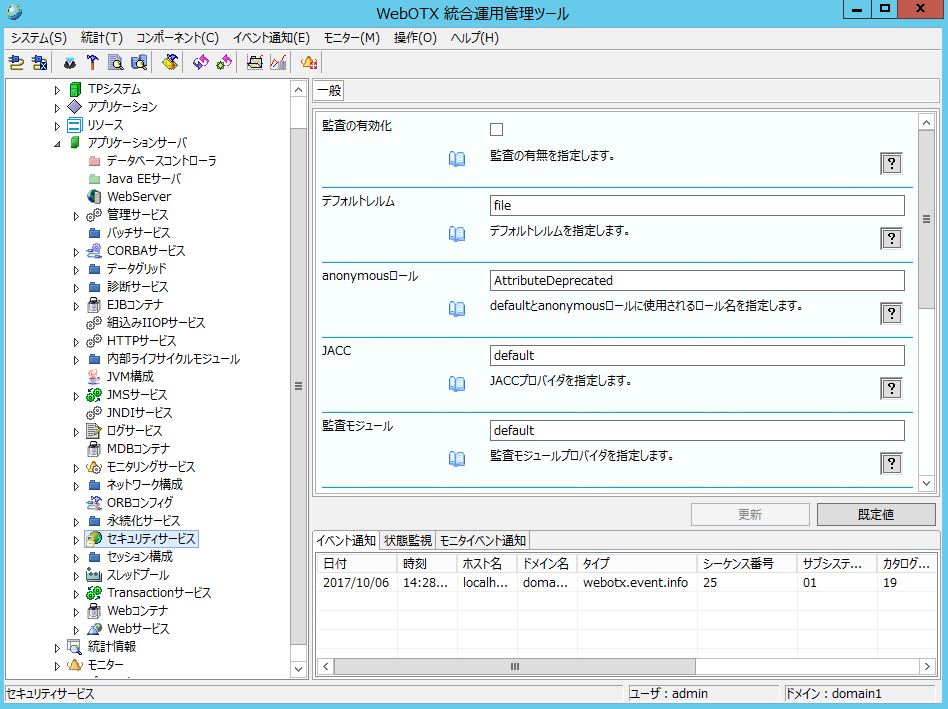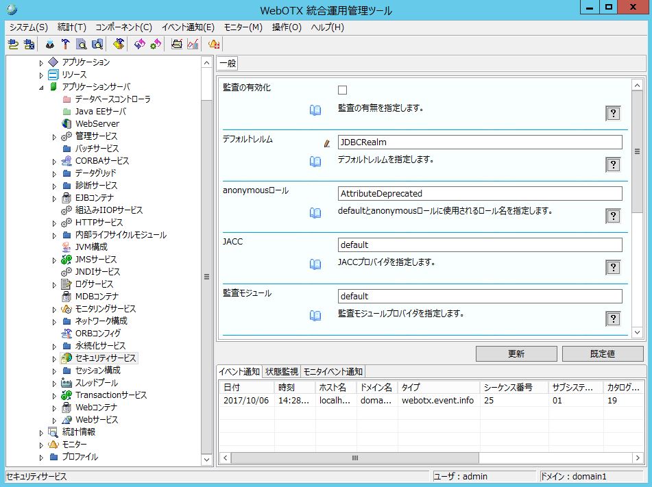 アプリケーションユーザの認証に使用するレルムの変更を行います。[domain1]-[アプリケーションサーバ]-[セキュリティサービス]をクリックします。デフォルトレルムの値を2のレルム名で指定した名前(本例ではfilesample)に変更し、[更新]ボタンを押します。