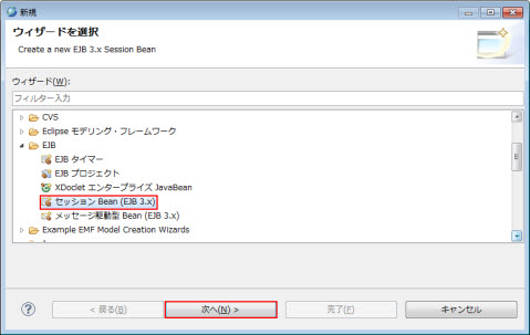 EJB > セッション Bean(EJB 3.x) を選択して、次へ をクリックします。