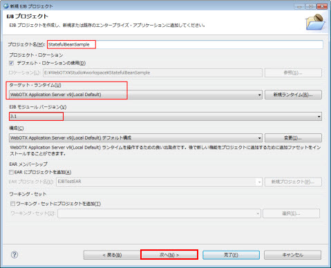 プロジェクト名 に新規プロジェクト名StatelessBeanSampleを入力して、