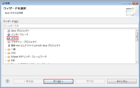 メニューの ファイル > 新規 > その他... を選択して、新規 ウィザード画面を表示します。クラス を選択して、次へをクリックします。