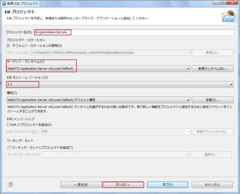 プロジェクト名に作成するプロジェクト名MessageDrivenBeanSampleを入力して、ターゲット・ランタイムにWebOTX Application Server v10.2(Local Default)を選択します。 次へ をクリックします。