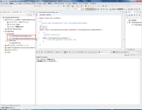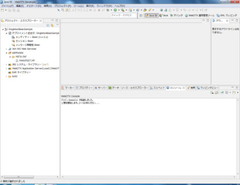 以降の、SingletonBeanSampleプロジェクトの、メソッド作成から、デプロイおよび動作確認に至る手順は、 前述のステートレスセッションBeanでの、EJBメソッドの作成 〜 ステートレスセッションBeanの実行(Webアプリケーションからの呼び出し)と同様ですので、そちらを参照してください。