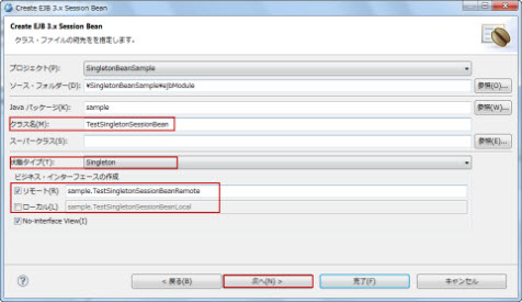 を、ここまでに作成したSingletonセッションBean の場合に合わせて、変更しながら進める必要があります。