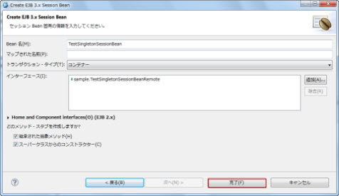 次のEJB 3.x メッセージ駆動型 Bean の作成画面で、完了をクリックします。