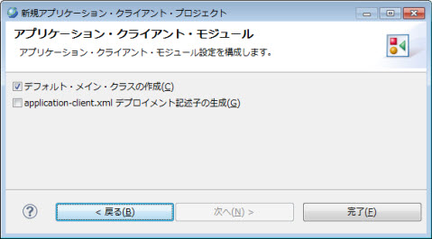 プロジェクト・ファセット 画面で アプリケーション・クライアント・モジュール のバージョンが1.4以下の場合、該当画面で application-client.xmlデプロイメント記述子の生成項目は表示されません。