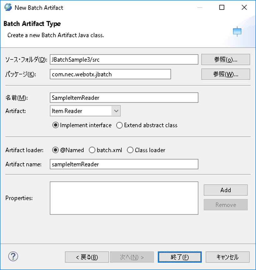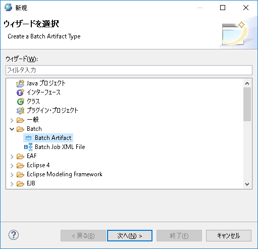 | Batch Job Artifactウィザード | ジョブの処理を実装する、Javaクラスファイルを作成するウィザードです。 |