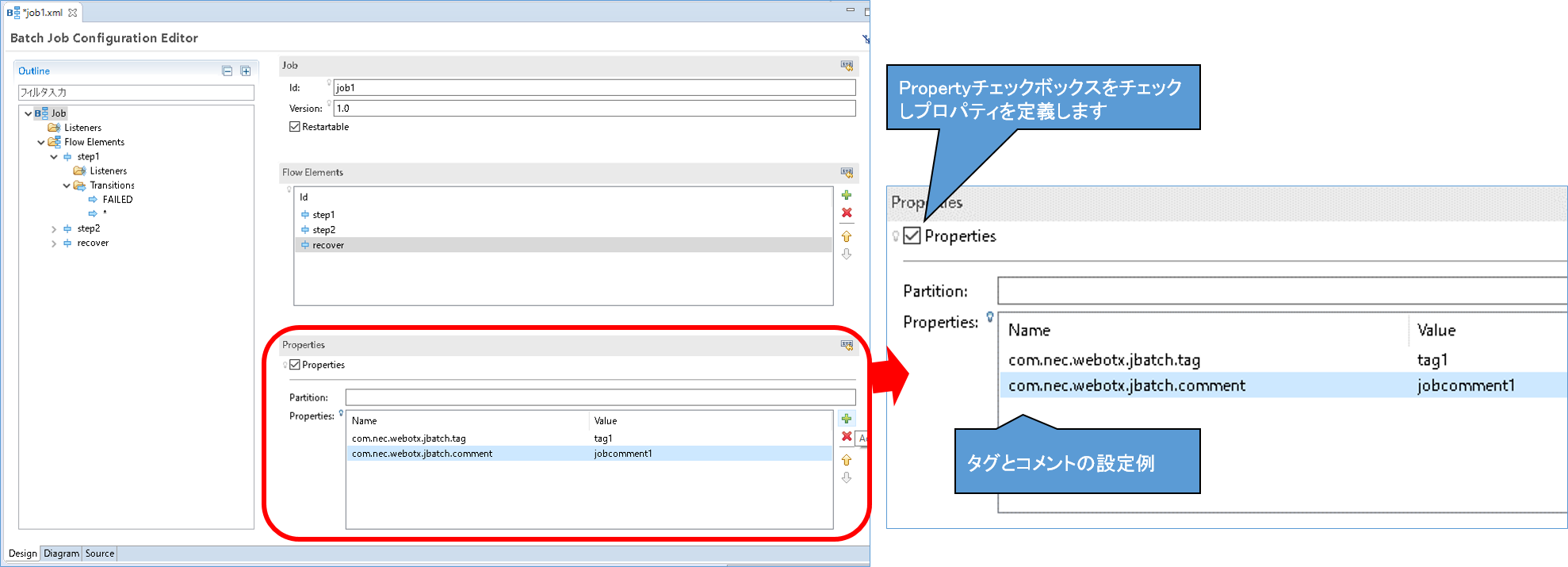 <property name="com.nec.webotx.jbatch.comment" value="jobcomment1"/> //ジョブのコメントとしてjobcomment1を指定。