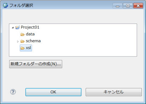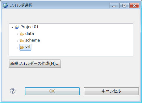 新規XMLマッピングファイル ダイアログ で、XSL出力先フォルダ にXSLファイルの出力先を指定します。ブラウズ(E) をクリックすると、XMLマッピングファイルのプロジェクトのフォルダからフォルダを選択することができます。
