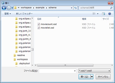 こののダイアログで、ワークスペースから、XMLスキーマ、WSDLファイルが選択できます。