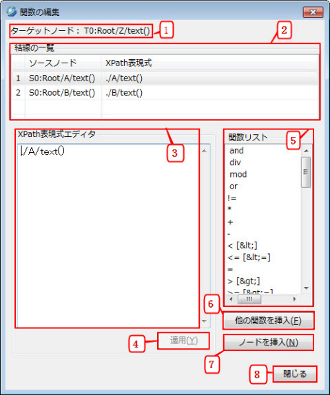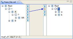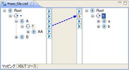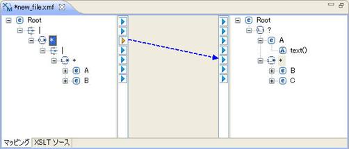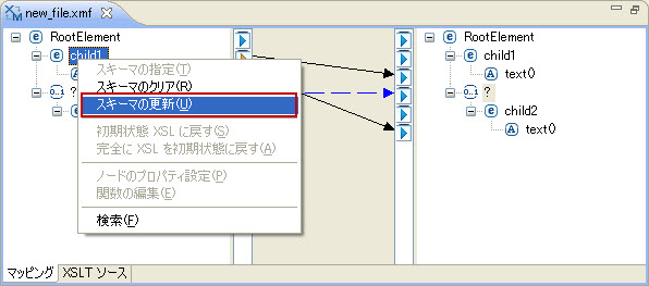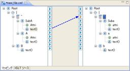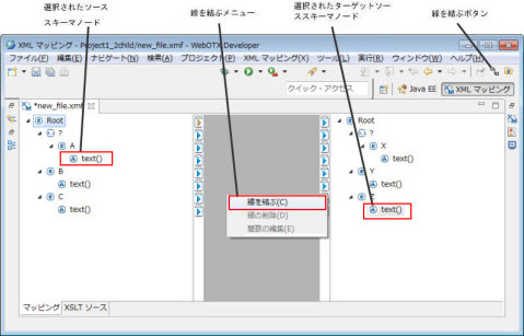 | 線を結ぶ(C) | ソーススキーマノードとターゲットスキーマノードの間に、線を結んで、マッピングを行います。 | 線を結ぶ | ||