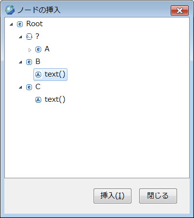 ・要素、オプション、イテレーション、チョイス、シーケンス等の子構造のうちどれか一つだけが出現することを表します。 ・どの子構造を出力するかを制御する機能を持ちます。 |